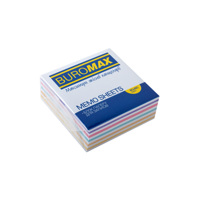 Щільність паперу: 55-60 г / м2Високоякісний офсетний папірРозмір блоку 80х80х20 ммКількість листів в блоці: до 250Тип скріплення: склеєнийКолір: 50% листів білого кольору + 50% кольорових листівУпаковка: прозора плівка (термоусадка)ТМ Buromax