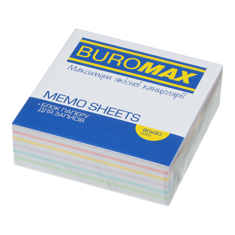 Щільність паперу: 70 г/м² (білі аркуші), 80 г/м² (кольорові аркуші)Офсетний папірРозмір блоку 90х90х40 ммКількість аркушів у блоці: 430-460СклеєнийКолір: білий + кольоровий (50% всіх аркушів блоку)Упаковка: прозора плівкаТМ Buromax
