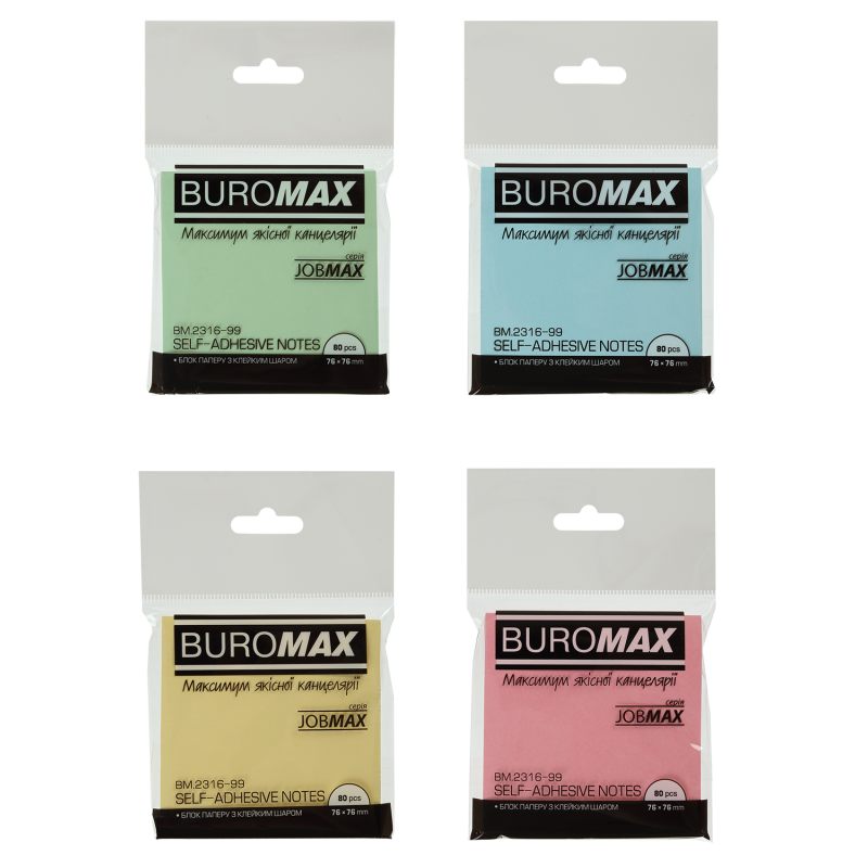 Щільність паперу: 75 г / м2Розмір блоку 51х76 ммВідмінно клеїться і тримається на поверхняхМожлива багаторазова переклеювання (слідів клею не залишається)Колір: пастельний асортіУпаковка: по 100 шт. одного кольору в блоціТМ Buromax