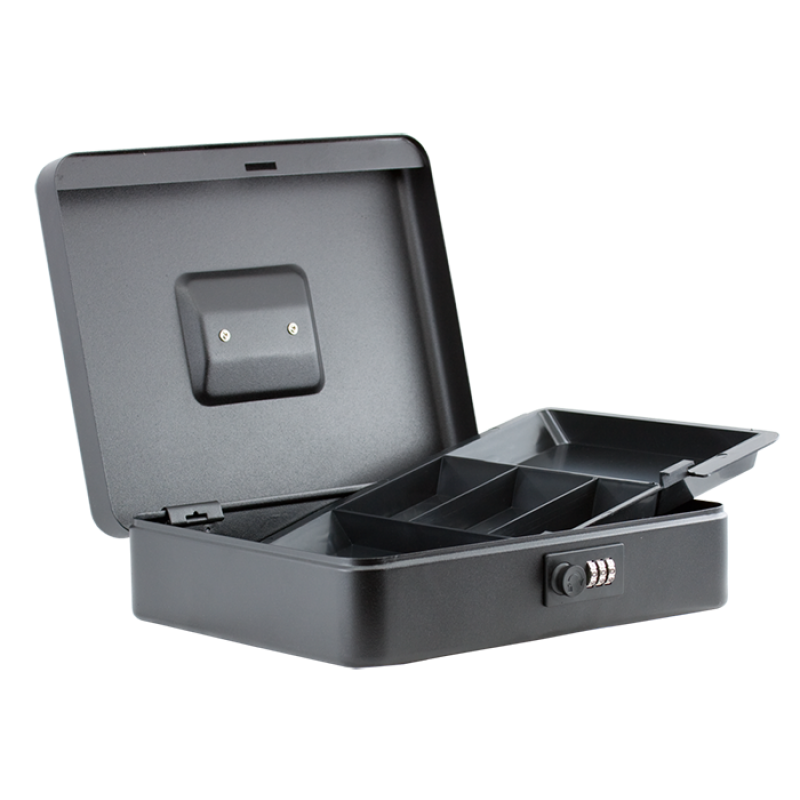 Матеріал: сталь 0,8 мм, покриття: високоміцне порошкове напилення, замок: кодовий, трьохрозрядний, знімний лоток з відділеннями для купюр і монет, колір-чорний матовий, розмір: 250х180х90мм.