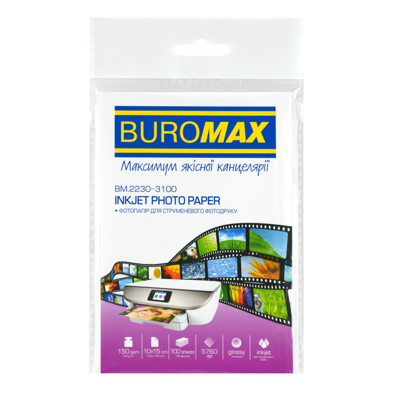 формат 10х15 смщільність 150 г/м2кількість аркушів 20миттєво висихає, що дозволяє максимально швидко працювати зі знімкамиповерхня: глянсова - завдяки гладкій глянсовій поверхні відбувається високоякісна передача яскравих насичених кольорів з безліччю відтінків.для струменевого друкуТМ Buromax