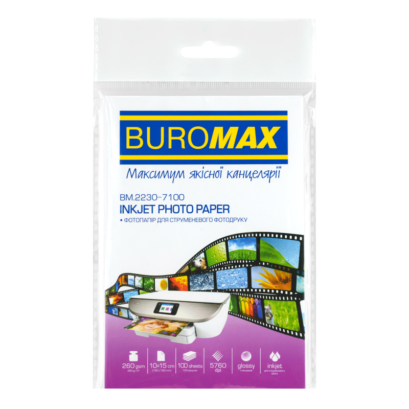 формат 10х15 смщільність 260 г/м2кількість аркушів 20миттєво висихає, що дозволяє максимально швидко працювати зі знімкамиповерхня: глянсова - завдяки гладкій глянсовій поверхні відбувається високоякісна передача яскравих насичених кольорів з безліччю відтінків.для струменевого друкуТМ Buromax