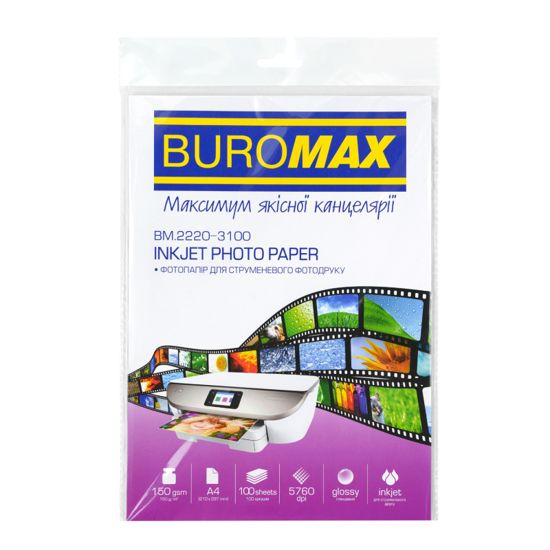 формат А4щільність 180 г / м2 (до 5760 dpi)кількість аркушів 100миттєво висихає, що дозволяє максимально швидко працювати зі знімкамиповерхню: глянцева - завдяки гладкій глянцевій поверхні відбувається високоякісна передача яскравих, насичених кольорів з безліччю відтінківдля струменевого друкуТМ Buromax
