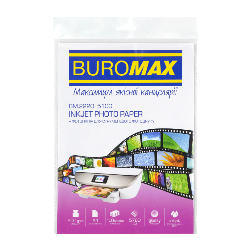 формат А4щільність 200 г / м2 (до 5760 dpi)кількість аркушів 20миттєво висихає, що дозволяє максимально швидко працювати зі знімкамиповерхня: глянцева - завдяки гладкій глянцевій поверхні відбувається високоякісна передача яскравих, насичених кольорів з безліччю відтінківдля струменевого друкуТМ Buromax
