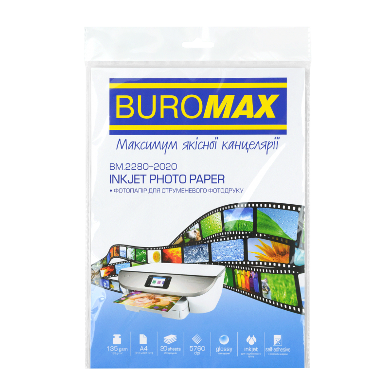 Фотопапір глянцевий самоклеючий А4, 210х297мм, 135г/м2 (20арк) BM.2280-2020