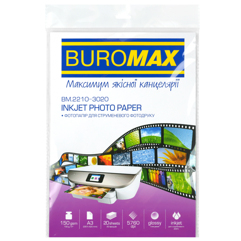 формат А4щільність 200 г / м2 (до 5760 dpi)кількість аркушів 20миттєво висихає, що дозволяє максимально швидко працювати зі знімкамиповерхня: глянцева - завдяки гладкій глянцевій поверхні відбувається високоякісна передача яскравих, насичених кольорів з безліччю відтінківдля струменевого друкуТМ Buromax