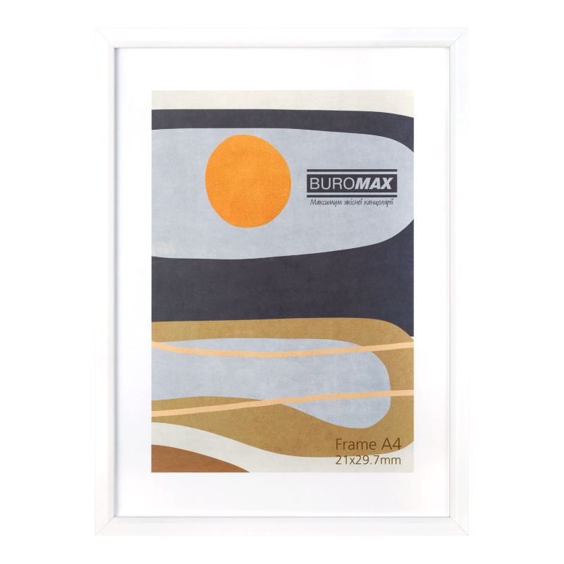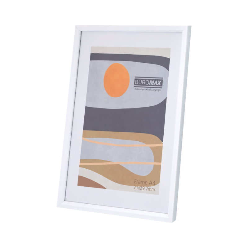розмір: А4 (210х297 мм)можливе як вертикальне так і горизонтальне розташуваннявкладення захищене прозорим скломрамка з міцного пластикузадня стінка з щільного ДВПнадійні металеві закріплювачі металеве кріплення для підвісу рамки в комплектіТМ Buromax