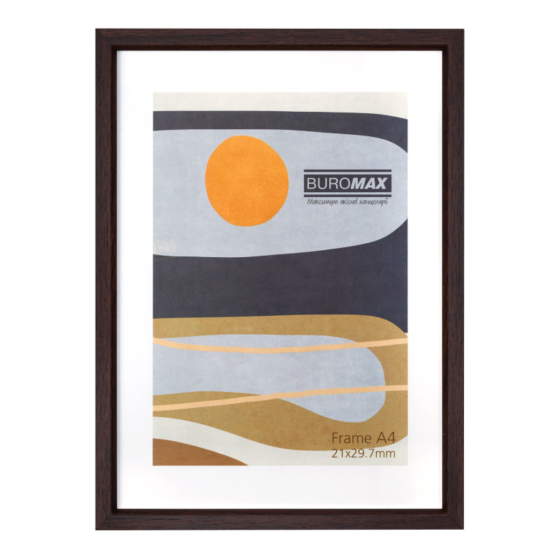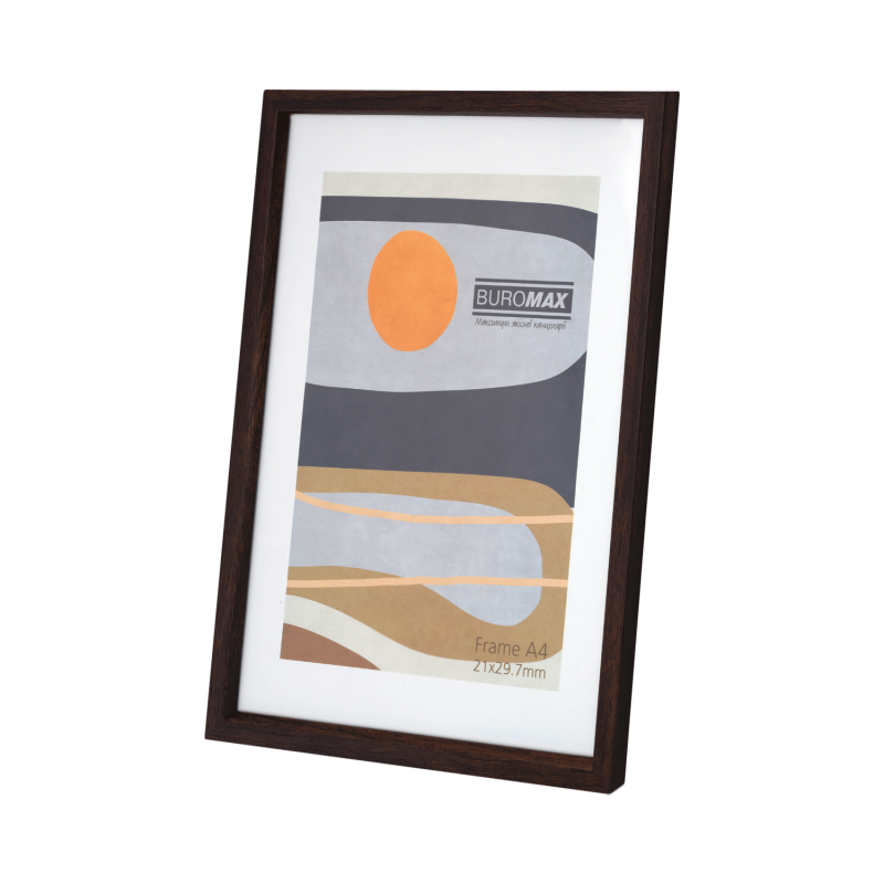 розмір: А4 (210х297 мм)можливе як вертикальне так і горизонтальне розташуваннявкладення захищене прозорим скломрамка з міцного пластикузадня стінка з щільного ДВПнадійні металеві закріплювачі металеве кріплення для підвісу рамки в комплектіТМ Buromax