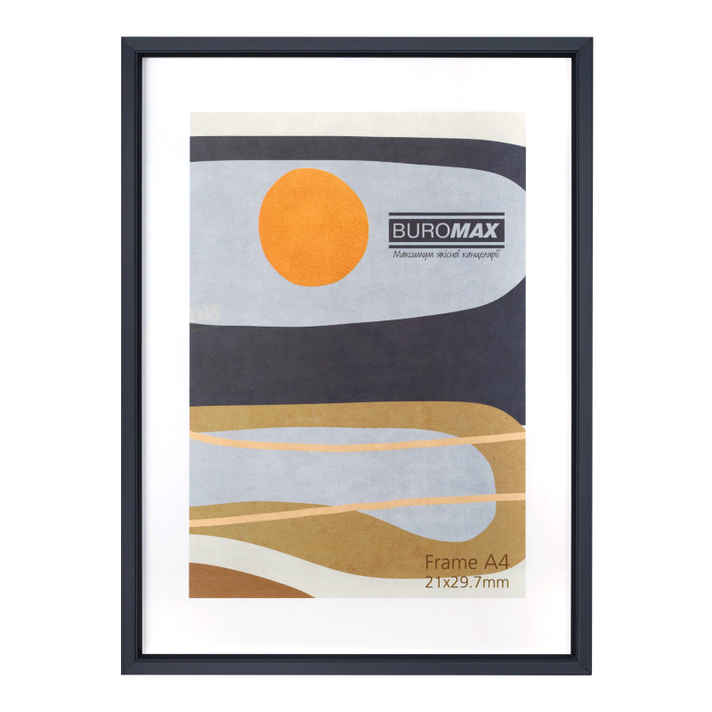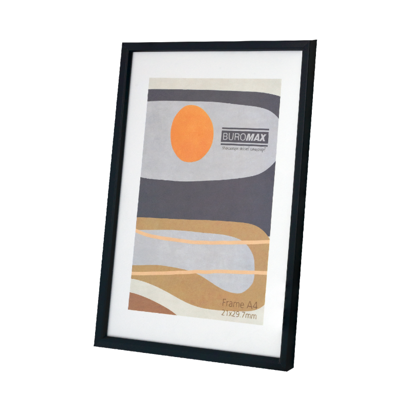 розмір: А4 (210х297 мм)можливе як вертикальне так і горизонтальне розташуваннявкладення захищене прозорим скломрамка з міцного пластикузадня стінка з щільного ДВПнадійні металеві закріплювачі металеве кріплення для підвісу рамки в комплектіТМ Buromax