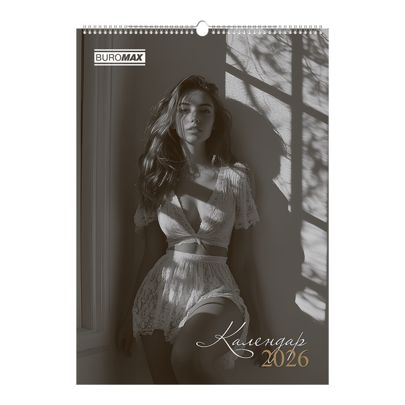 складається з 13 аркушів: перший аркуш – дизайнерський малюнок із зазначенням року, кожен наступний лист має дизайнерський малюнок та календар на 1 місяць року.формат А3виготовлений з крейдованого паперу щільністю 200 г/м²скріплення: на металеву горизонтальну пружину білого кольору, яка має вигин для підвісуТМ Buromax
