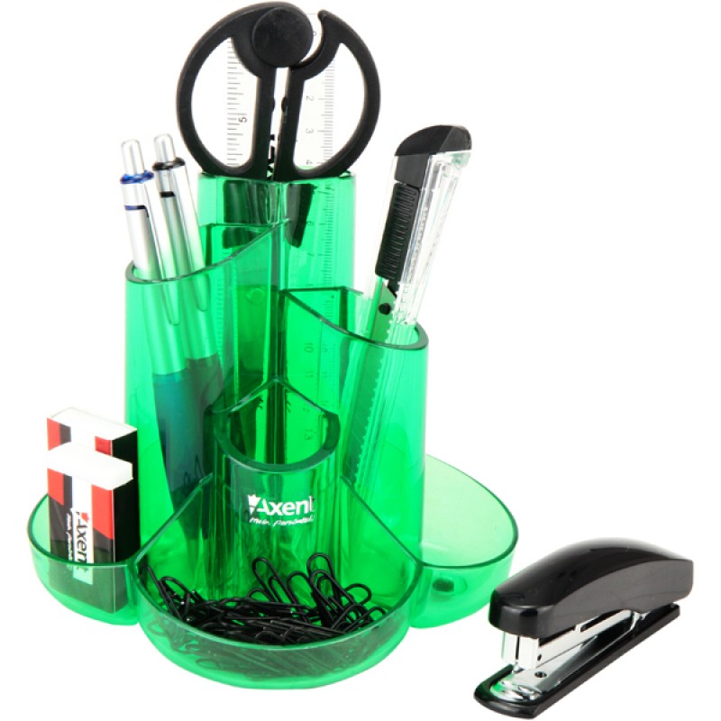 Наповнення: ножиці, лінійка, степлер, ніж канцелярський, скоби, гумка, скріпки, ручка, механічний олівець. 9 предметів. Запакований у коробку.