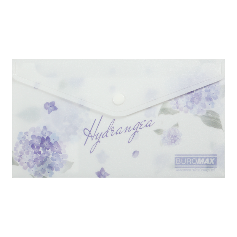 Папка-конверт на кнопці, глянцева, прозора. Товщина пластика: 170мкм. Поліпропілен (РР).