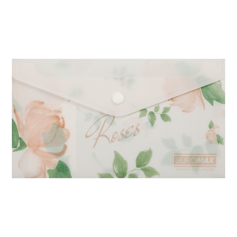Папка-конверт на кнопці, глянцева, прозора. Товщина пластика: 170мкм. Поліпропілен (РР).