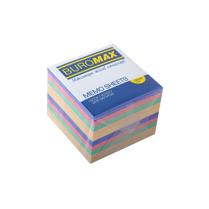 Плотность бумаги: 60 г/м2Высококачественная офсетная бумагаРазмер блока 80х80х30 ммКоличество листов в блоке: до 330Тип скрепления: склеенныйЦвет: цветные листы ассортиУпаковка: прозрачная пленка (термоусадка)ТМ Buromax