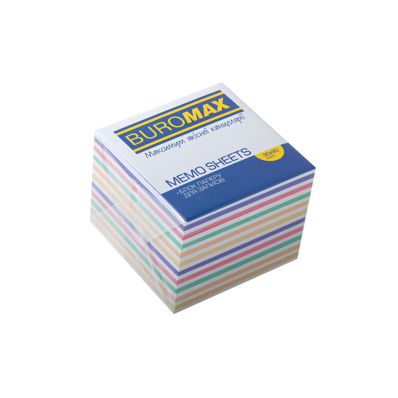 Плотность бумаги: 60 г/м2Высококачественная офсетная бумагаРазмер блока 80х80х30 ммКоличество листов в блоке: до 330Тип скрепления: склеенныйЦвет: цветные листы ассортиУпаковка: прозрачная пленка (термоусадка)ТМ Buromax