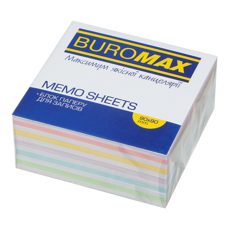 Плотность бумаги: 70 г/м² (белые листы), 80 г/м² (цветные листы)Офсетная бумагаРазмер блока 90х90х40 ммКоличество листов в блоке: 430-460СклеенныйЦвет: белый + цветной (50% всех листов блока)Упаковка: прозрачная пленка ТМ Buromax