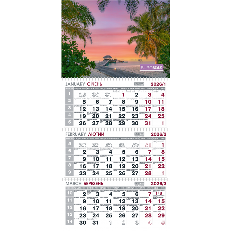 настенный квартальный календарь на 3 пружинах;3 блока с месяцами общий размер – 298х630мм;размер листов – 298х140мм;листы – из мелованной бумаги;постер – из высококачественного картона;указатель дат с бегунком и крепежное отверстие;календарная сетка на украинском языке;государственные праздники обозначены красным цветом;порядковая нумерация недель;каждый календарь – в индивидуальной упаковке.