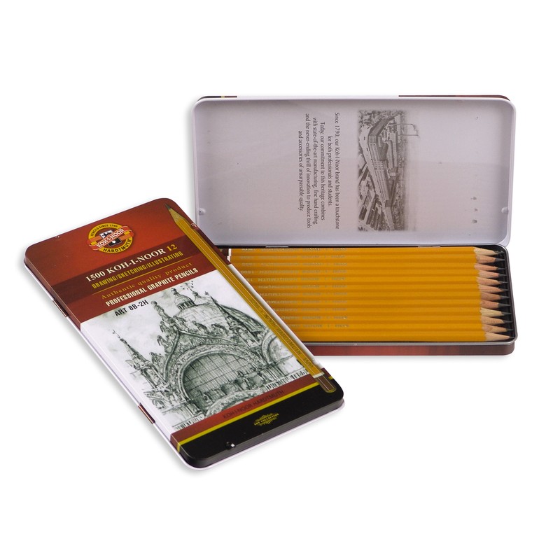 Набор графитных карандашей 1500. Металлическая коробка. Предназначены для графических работ. Без ластика. Шестигранные. Твердость: 5В-5Н. ТМ KOH-I-NOOR