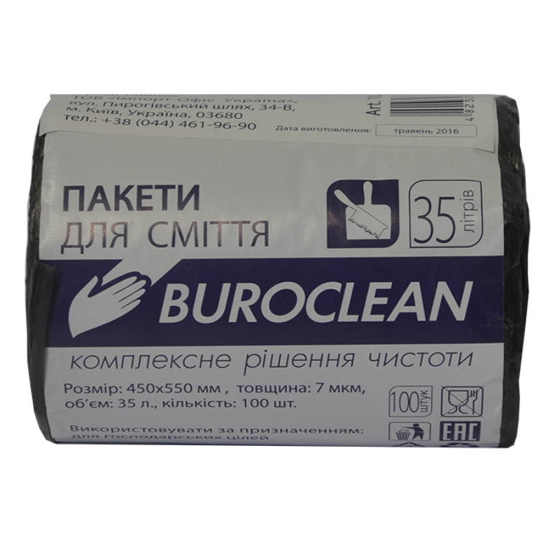 Обьем: 35 литров; 100 штук в намотке; размер: 450х550 мм; материал: HDPE; толщина: 7 мкм; цвет: черный.