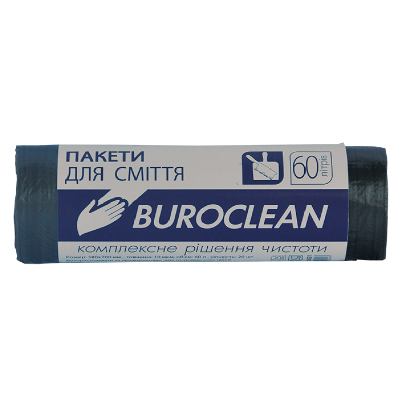 Обьем: 60 литров; 20 штук в намотке; размер: 580х700 мм; материал: HDPE; толщина: 10 мкм; цвет: черный.